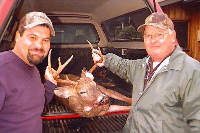 He bowhunts with his dad in the picture, who by